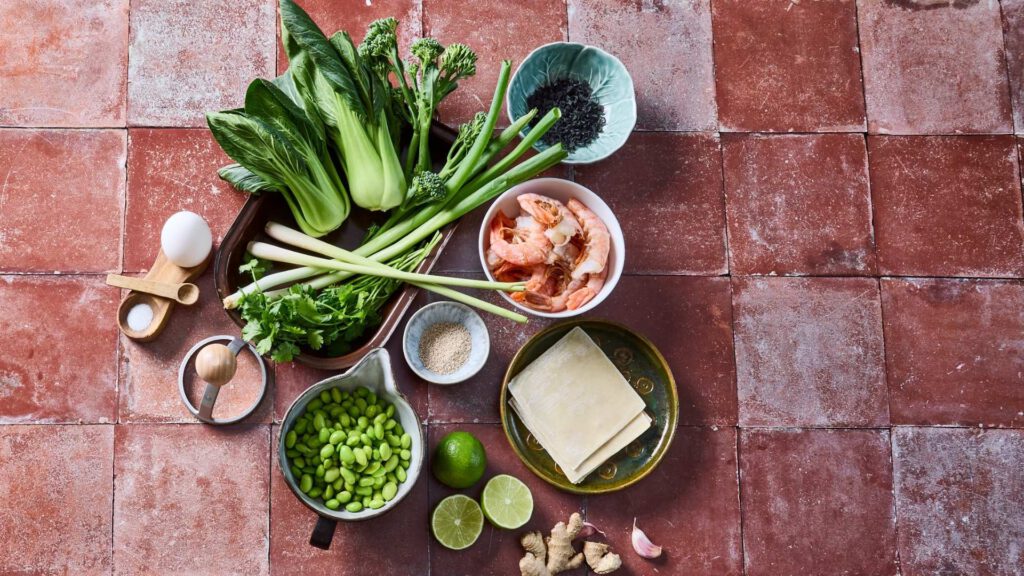 Zutaten für das Gericht: Wildgarnelen-Ravioli in Limetten-Dashi mit Gemüse
